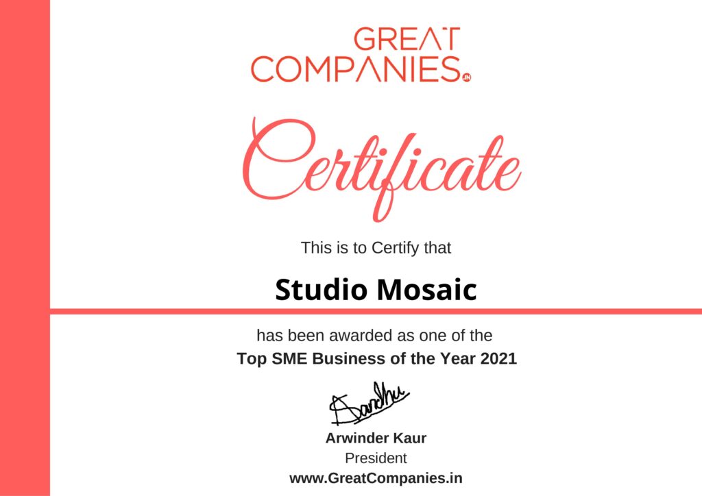 GreatCompanies, a leading online platform for entrepreneurs, has recognised Studio Mosaic as one of the Top SME Businesses for the Year 2021.